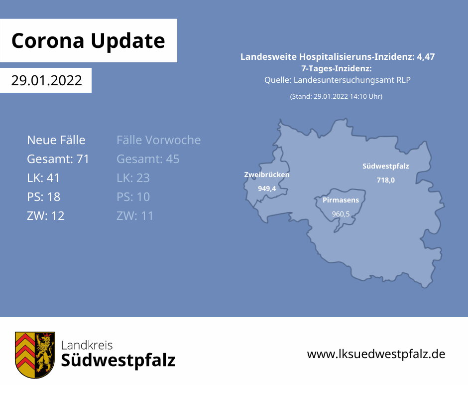 Nach aktuellem Stand (31.01.2022; 11:00 Uhr) haben sich im Zuständigkeitsbereich des Gesundheitsamts seit dem Vortag 279 weitere COVID-19-Fälle bestätigt. Das Landesuntersuchungsamt RLP (LUA) meldet aktuell (Stand 31.01.2022; 11:10 Uhr) die Inzidenzwerte 669,1 (LK), 943,0 (PS) sowie 987,7 (ZW) und …