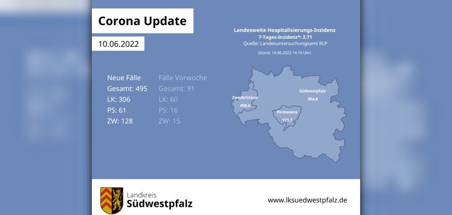 Nach aktuellem Stand (10.06.2022; 11:00 Uhr) wurden im Zuständigkeitsbereich des Gesundheitsamts seit Dienstag weitere 495 bestätigte COVID-19-Fälle erfasst. Das Landesuntersuchungsamt RLP (LUA) meldet aktuell (Stand 10.06.2022; 14:10 Uhr) die Inzidenzwerte 384,0 (LK), 171,7 (PS) sowie 408,6 (ZW) und für die landesweite „7-Tage-Hospitalisierungs-Inzidenz“ den Wert 2,71.